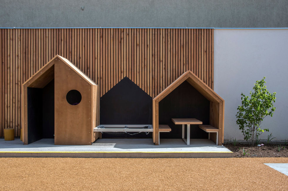 Na nárožním pozemku byl nahrazen původní objekt prodejny potravin novostavbou mateřské školy. Velmi omezený prostor zahrady byl rozšířen o obytnou střechu a herní terasu orientovanou do prostoru přilehlé ulice. Školní zahrada (dvorek) byl v prostorově úsporném režimu vybaven atypovým mobiliářem a herními stěnami. Obytný prostor bude rámován baldachýnem soliterní třešně.
